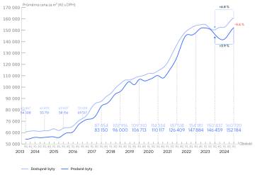 Na konci třetího letošního čtvrtletí došlo k prolomení nových historických maxim průměrných nabídkových i prodejních cen. Průměrná nabídková cena nových bytů dosáhla 160 720 Kč/m², což představuje meziroční nárůst o 6,8 % a mezikvartální o 2,5 %. Podobný trend zaznamenal i průměr prodejních cen, který vzrostl na 152 184 Kč/m², mezikvartálně o 3,6 % a meziročně o 3,9 %. Na konci letošního třetího čtvrtletí tak ceny nových bytů v Praze přesáhly 5% růst, který predikovala ČNB ve zprávě o finanční stabilitě pro celý letošní rok.