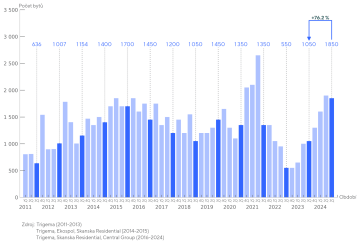 Nejnovější data z rezidenčního trhu nadále potvrzují silný návrat odložené poptávky, která se oproti loňskému roku téměř zdvojnásobila. Za první tři letošní čtvrtletí se v Praze prodalo 5 350 nových bytů, což je meziroční nárůst o 98 %. Vysoká poptávka se odráží také v růstu cen nových bytů. Nabídkové i prodejní ceny dosáhly nových maxim a překonaly hranici 160 tisíc Kč/m2, resp. 152 tisíc Kč/m2. To je dáno dražšími projekty, které byly nově uvedeny na trh, zdražením stávajících bytů v nabídce a celkově nedostatečným množstvím volných jednotek na trhu. Vyplývá z tržní analýzy developerských společností Central Group, Skanska a Trigema.