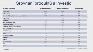 Březnový průzkum opět potvrdil, že nejpoužívanějším produktem pro uložení peněz je spořící účet, který si u Čechů drží dlouhodobé prvenství. S velkým odstupem pak následují investiční produkty jako podílové fondy a nemovitosti. Podle průzkumu využívá spořící účet 59 procent dotázaných, do podílových fondů investuje 17 procent respondentů a 14 procent ukládá své prostředky do nemovitostí.