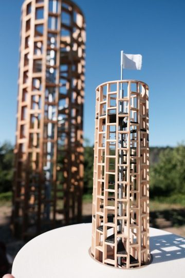 Koncepce vyhlídkového stožáru vychází z historie terasovitých svahů na břehu Vltavy, kde se od konce 19. století těžila hlína pro cihelnu rodiny Fischerů. Právě věhlas libčických cihlářů, kteří se kromě výroby cihel specializovali na výstavbu továrenských komínů, kterých v Čechách postavili více než 1000, inspiroval autorku návrhu Kristýnu Rejskovou.