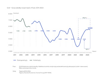 V Praze bylo na konci loňského roku volných 5 500 nových bytů, tj. mezikvartálně o 2 % méně a meziročně o 8 % více. Nabídku v loňském roce omezily odklady některých developerských projektů způsobené pomalým prodejním tempem prvního pololetí a vysoké stavební náklady, především ceny stavebních materiálů. Svůj vliv měla také transformace části projektů na nájemní bydlení a přetrvávající pomalé povolování nové výstavby. Podle posledních dat ČSÚ se do loňského listopadu v hlavním městě povolilo jen 3 608 bytů v bytových domech, tedy meziročně o 12,6 % méně.