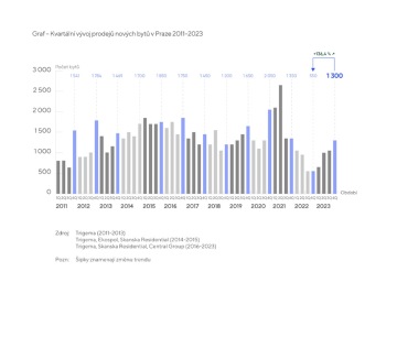V posledním čtvrtletí loňského roku se v Praze prodalo 1 300 nových bytů, což představuje meziroční nárůst o 136 % a je to o 24 % více než v předchozím čtvrtletí. Celý loňský rok se pražský trh s novými byty vyznačoval pozvolným růstem poptávky a z nejčerstvějších dat z rezidenčního trhu vyplývá, že se prodeje vrací na úroveň před pandemií. Celkem se v loňském roce v hlavním městě prodalo 4 000 nových bytů, a to je ve srovnání s rokem 2022 narůst o 29 %.