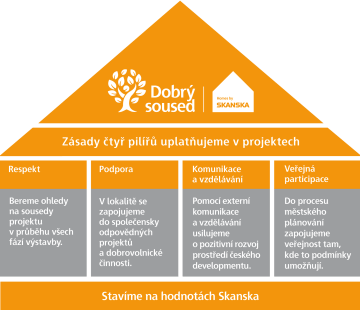 Nákupem nové akvizice a vstupem do lokality se také Skanska stává sousedem pro stávající obyvatele. Proto i my přemýšlíme o tom, jak v této pozici dlouhodobě obstát. Naše principy dobrého sousedství jsme postavili na těchto čtyřech pilířích.