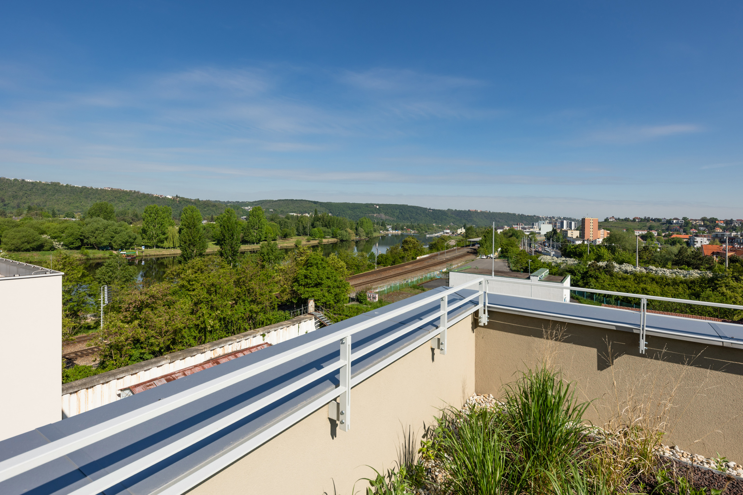 This lucrative 5+kk apartment with an area of 143.2 m² with a generous living room and kitchenette is located on the 4th floor. There is direct access to the terrace (36.5 m²) with a roof garden (59.9 m²), a place for a hot tub and beautiful views of the river and the surrounding greenery. The apartment offers three bedrooms, a study, two bathrooms and practical storage spaces. The advantage is the immediate possibility of moving in - the apartment is completed and approved.