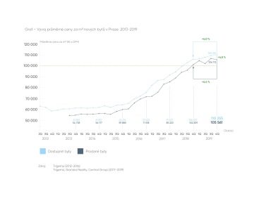 Loni se v Praze podle analýzy společností Trigema, Skanska Reality a Central Group prodalo celkově 5 600 nových bytů. To je o 12 % více než v předcházejícím roce. Průměrná cena nového bytu byla ve čtvrtém čtvrtletí ve výši 105 561 korun na m2. Nabídka dosáhla ke konci roku hodnoty 4 950 jednotek a stále se tak drží na velmi nízké úrovni. Mimo metropoli bylo dohromady prodáno 4 370 nových bytů, tedy obdobně jako v roce 2018.