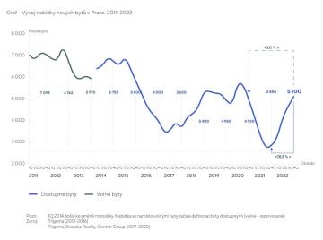 V Praze bylo na konci posledního čtvrtletí loňského roku volných 5 100 nových bytů, což je téměř stejné číslo jako na konci roku 2020. Mezikvartálně jde o zhruba 8,5% nárůst, v porovnání s loňským rokem, kdy byl trh prakticky vyprodaný a nabídka byla na rekordním minimu, je nyní nabídka vyšší o 79 %.