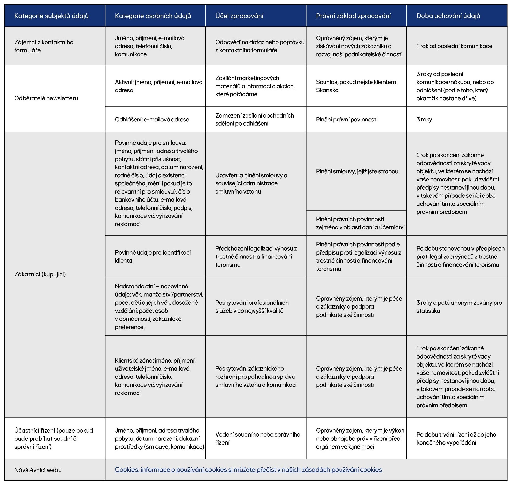 Tímto dokumentem vám společnost Skanska Residential a.s. (dále i „Skanska“, „my“, „náš / naše“, „nás / nám“) poskytuje informace o tom, jak zpracováváme vaše osobní údaje a jak je zajištěno, že jsou vaše osobní údaje zpracovávány odpovědným způsobem a v souladu zejména s nařízením (EU) 2016/679 o ochraně osobních údajů, známým pod zkratkou GDPR.