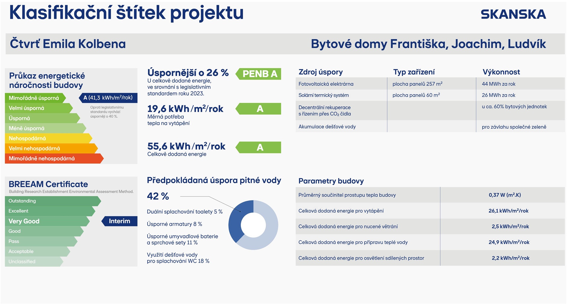 Projekt cílí na certifikaci BREEAM Very Good a získal energetický průkaz PENB A (mimořádně úsporný provoz) nabízí celou řadu moderních řešení: